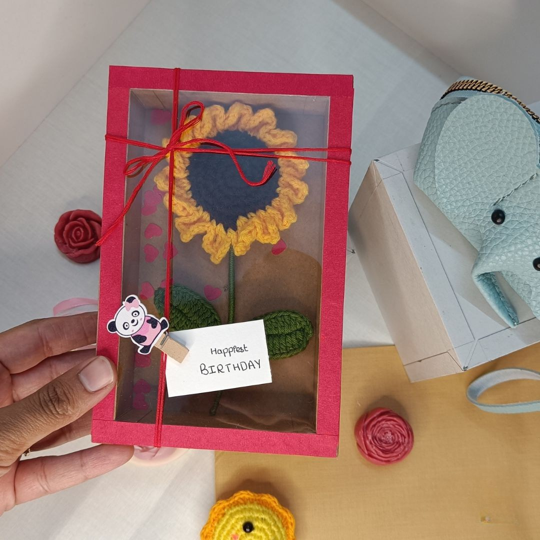 The box comes with a transparent sheet window for display, a wooden clip to attach your note, and space for personalized wishes — making it a ready-to-gift piece. Unlike real flowers, this crochet sunflower never fades, so your love and good wishes last forever.