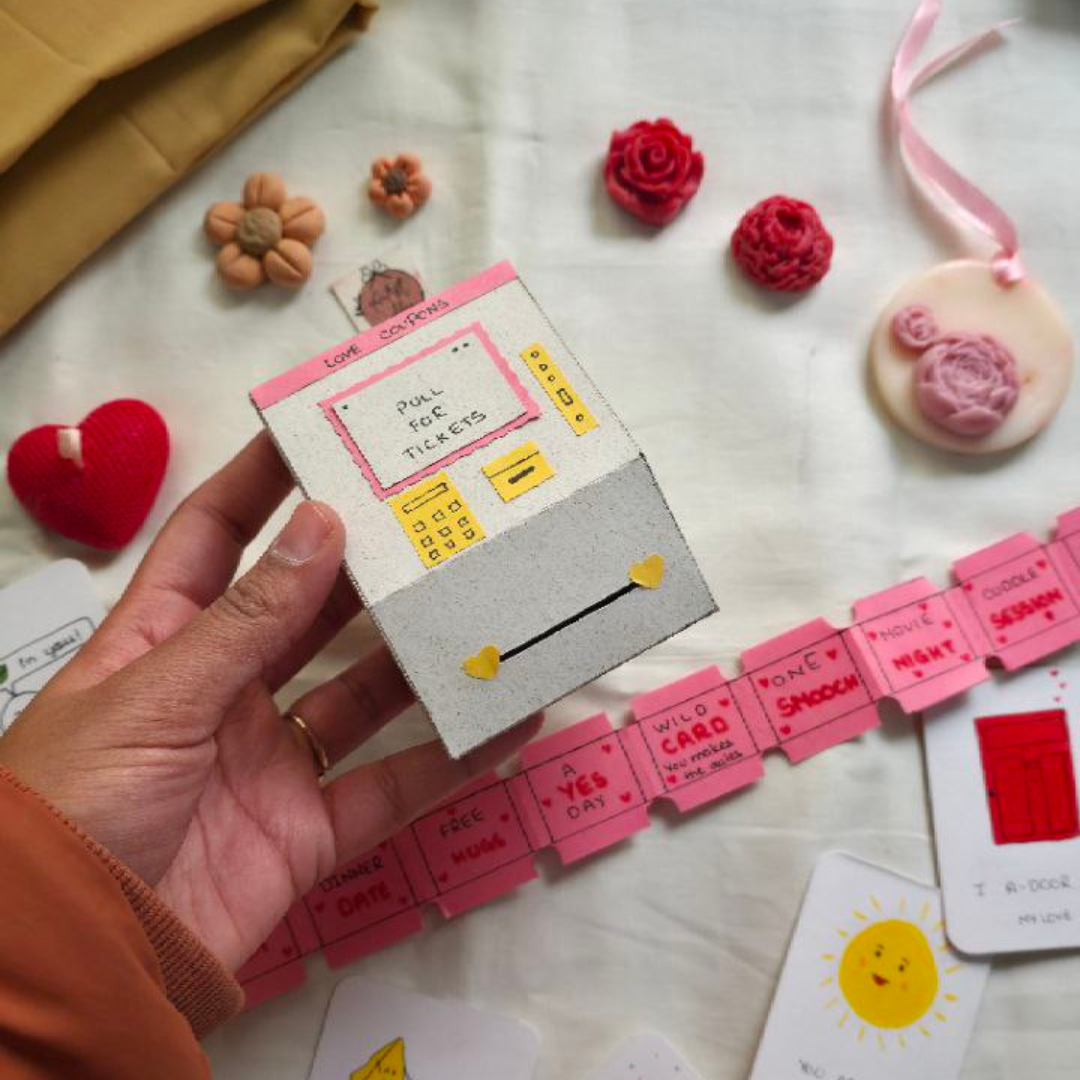 Make your love extra special with this cute and interactive Love Coupon Vending Machine Box. Designed like a mini vending machine, this handcrafted box dispenses sweet love coupons with romantic surprises written on them. Just pull the strip and reveal fun, loving, and meaningful coupons like hugs, kisses, movie nights, and special dates.