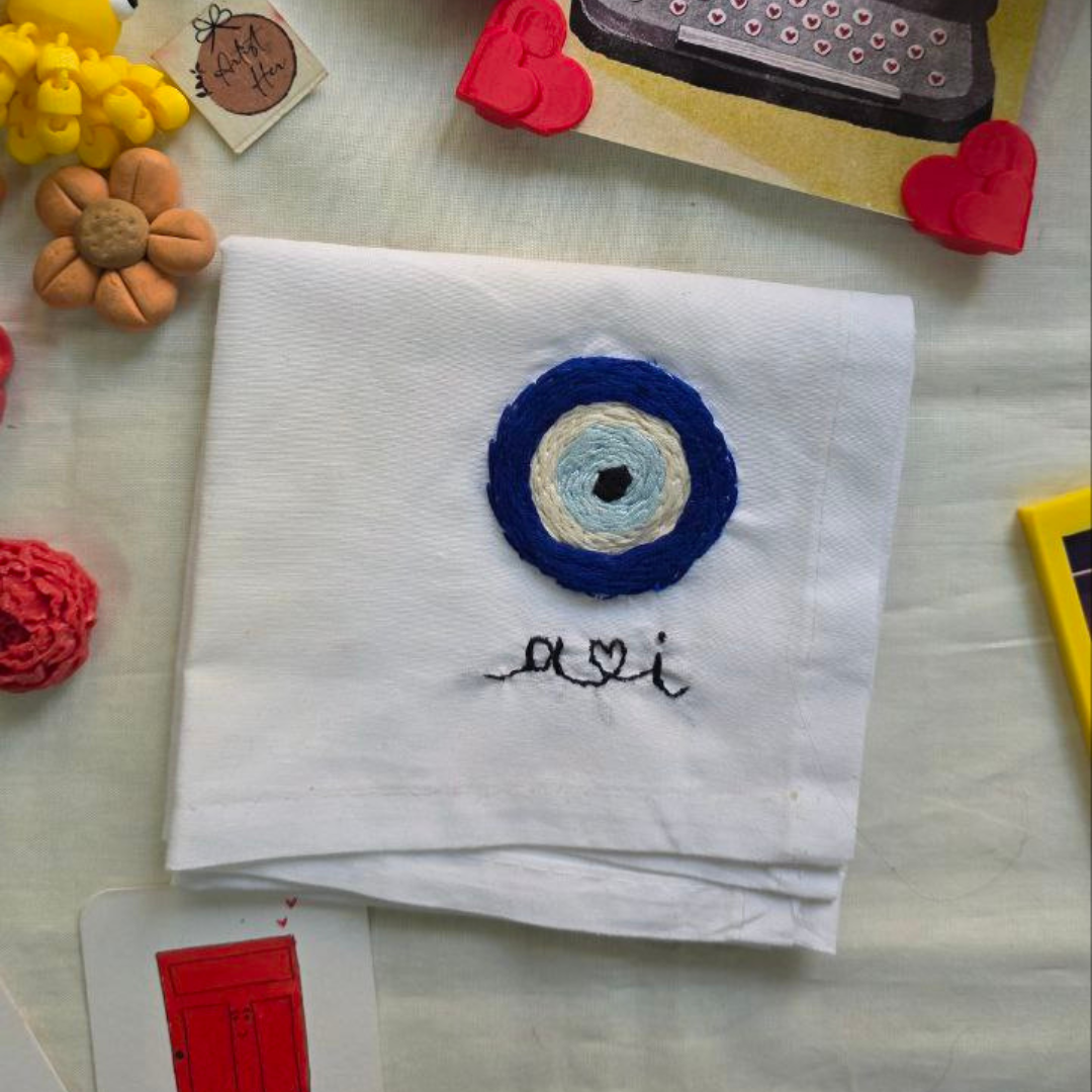 Add a touch of tradition and love to everyday essentials with our Evil Eye Embroidered Handkerchief. Featuring a hand-stitched evil eye motif and a delicate name embroidery below, this piece is designed to symbolize protection, positivity, and care. Made on soft white fabric, it is both meaningful and practical.