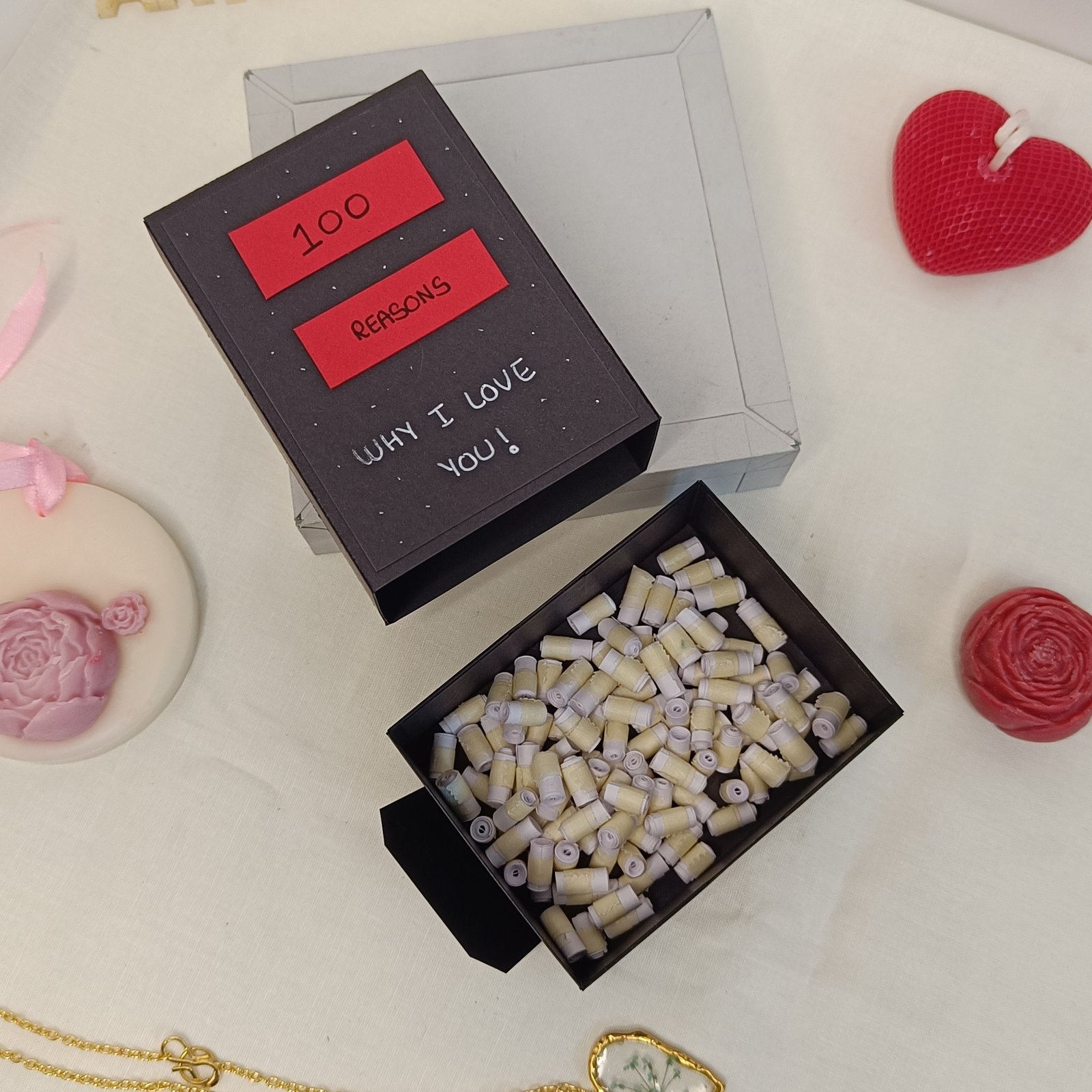 Express your love in the most heartfelt and meaningful way with this beautifully handcrafted 100 Reasons Why I Love You Box. Designed in a charming matchbox-style format, this unique gift is filled with 100 tiny rolled messages — each one containing a special reason why you love them. Every scroll is carefully handwritten and rolled with love, making this box a treasure your partner will hold close forever.