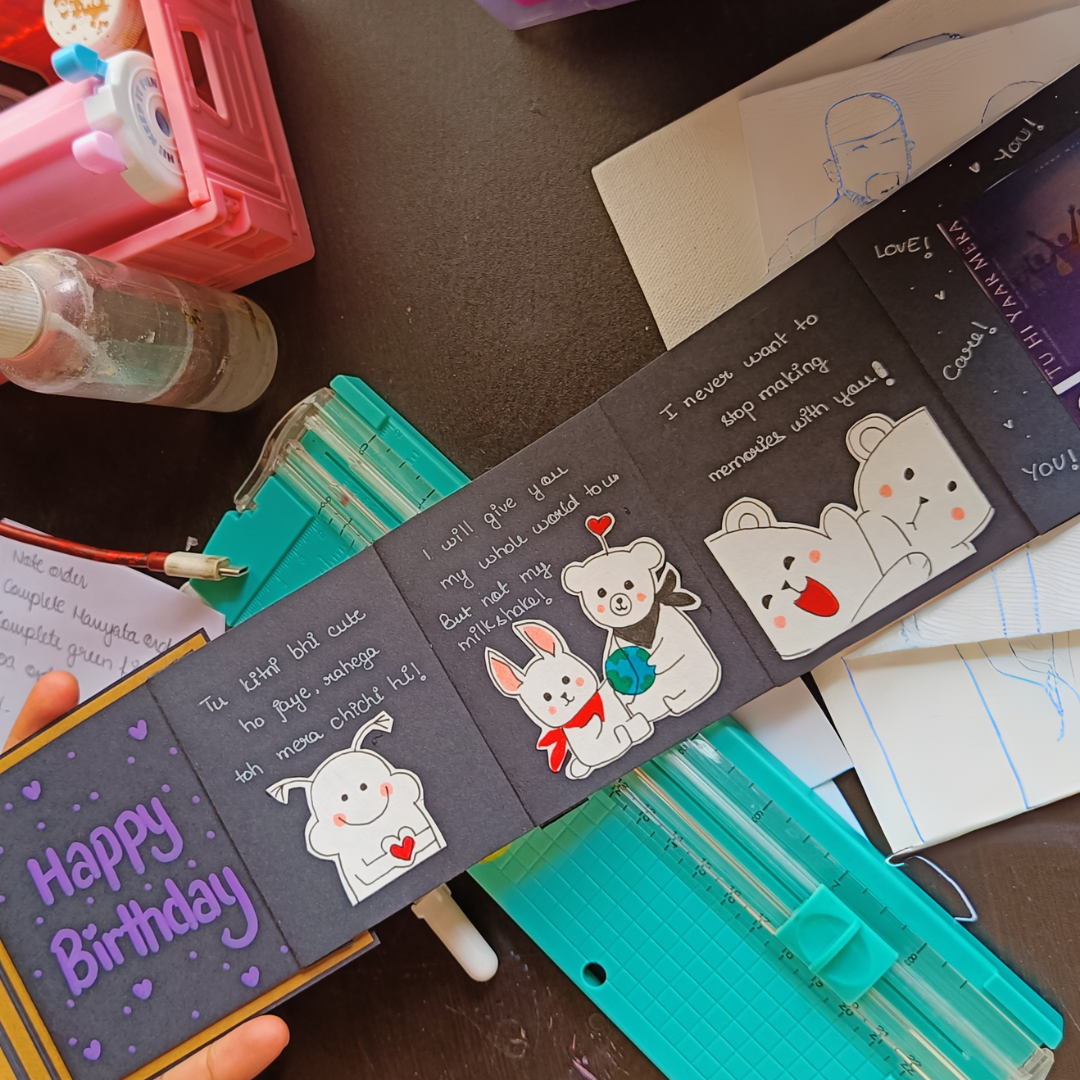 Open the card to reveal an extended accordion layout filled with adorable character drawings, sweet notes and playful birthday wishes. Each panel is crafted with care to bring joy, surprise and a personal touch. This unique folding design allows you to express multiple thoughts and emotions in one beautifully arranged keepsake.