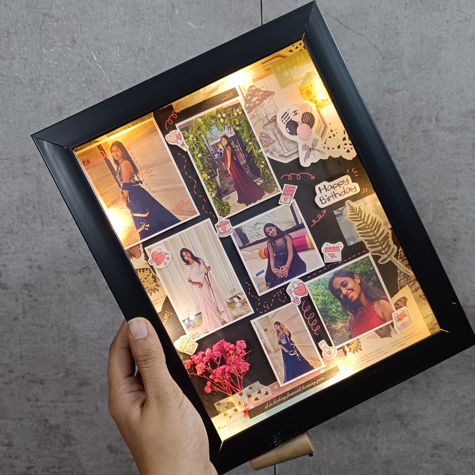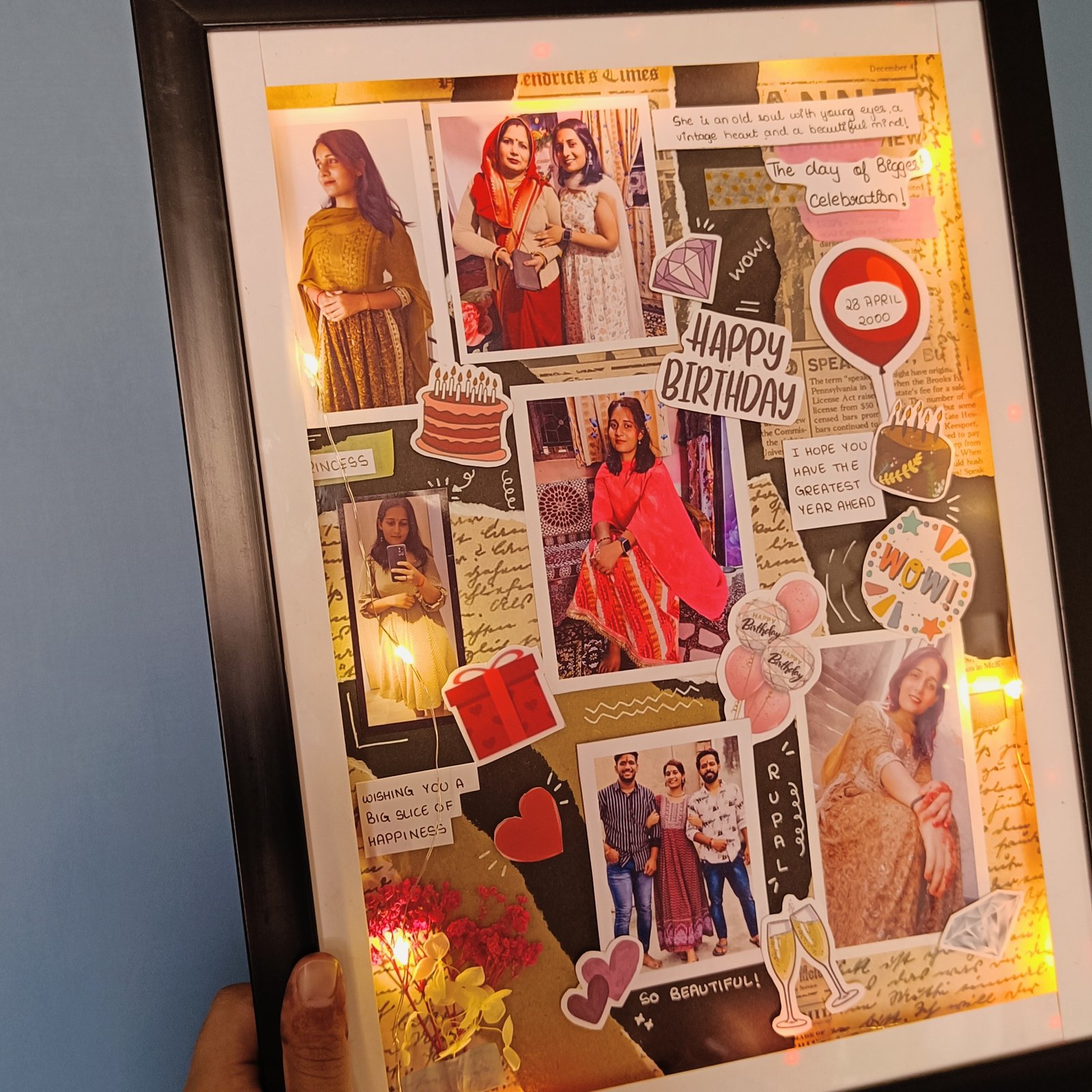 Celebrate your loved one with a Handmade LED Photo Collage Frame designed to turn their happiest memories into a glowing work of art. Each frame is uniquely handcrafted using premium materials, aesthetic scrapbook-style layering, personalised stickers, and warm LED lights that make every photo stand out beautifully.