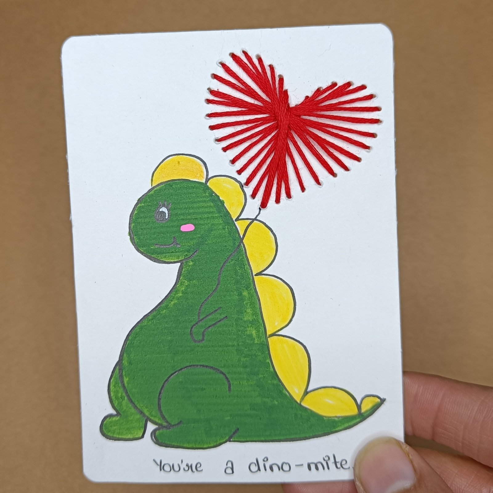 Bring a smile to someone special with this handmade love greeting card, featuring a cute green dinosaur holding a hand-stitched red thread heart balloon. With its playful pun “You’re a dino-mite!”, this card is a perfect mix of fun, love, and creativity.