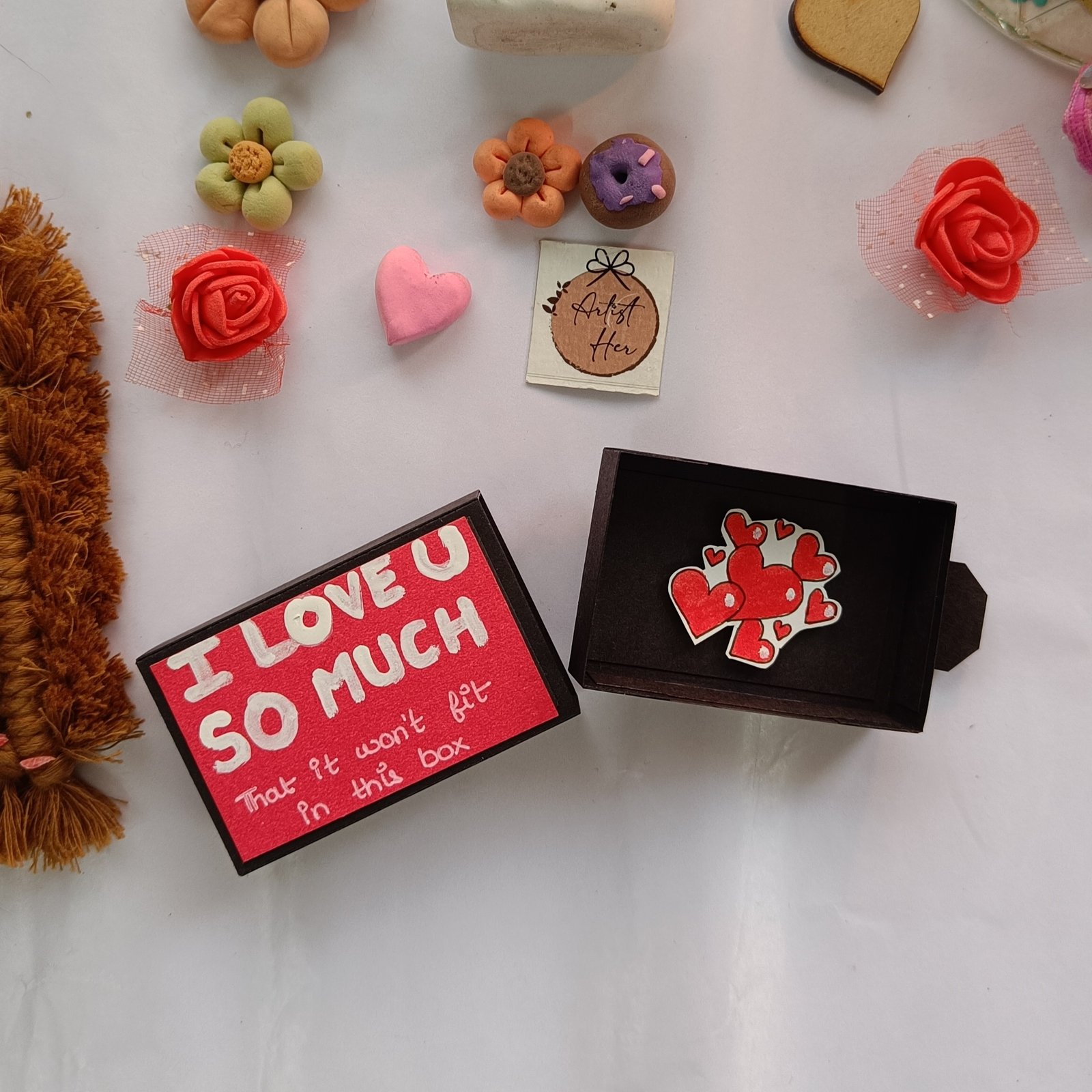 Sometimes words aren’t enough – but this little matchbox says it all! Featuring a bold message “I Love U So Much That It Won’t Fit in This Box” on the outside, and a burst of tiny red hearts on the inside, this mini creation is the cutest way to express endless love.