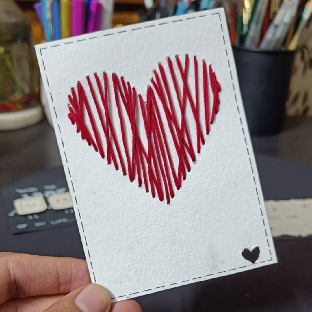 Sometimes, simplicity says it all. This handmade greeting card features a bold red heart created with hand-stitched thread embroidery, outlined with a delicate border and finished with a tiny heart cut-out at the corner. Its minimalist design makes it a timeless way to express love without needing many words.