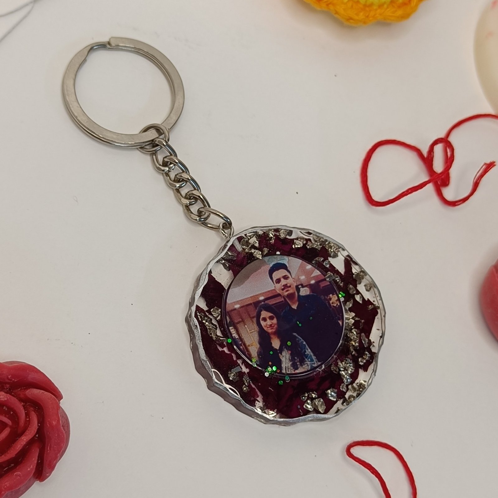 Treasure your memories every day with this round resin photo keychain. Designed with dried flowers, silver flakes, and a glossy agate-inspired finish, it’s a stylish and heartfelt keepsake.